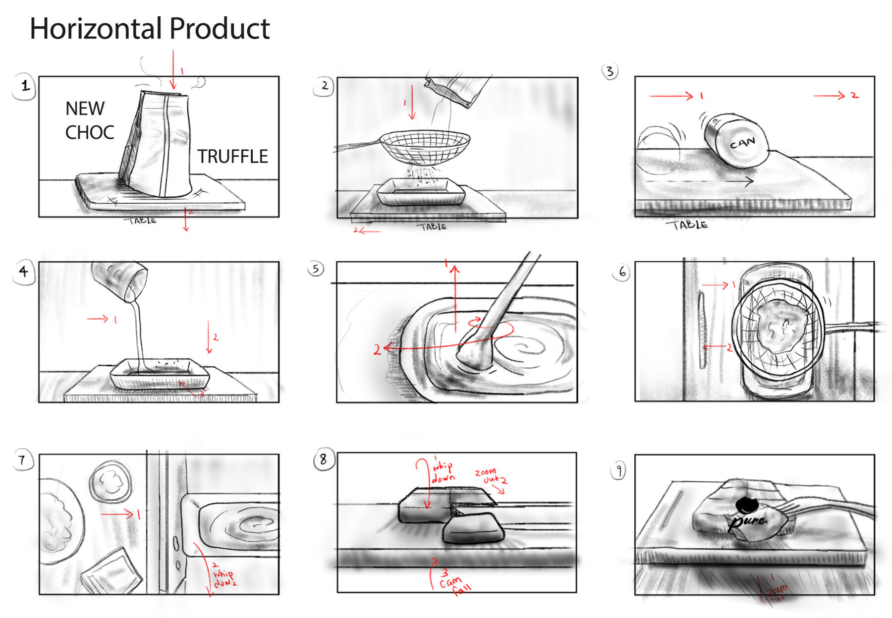 The final attempt (Figure 7-10) simulated a two-ingredient dessert: chocolate truffles, referencing Vais’s recipe (2021) using 80g of unsweetened cocoa powder and 180g of condensed milk. Since this is a self-funded project with a restrictive budget, the decision was made to simulate an easy homemade recipe. The rectified draft was simplified and incorporated more consistent creative in-camera transitions and various camera angles to minimise disparities, as listed in the revised shot list, which met ELM central and peripheral routes and IPM four factors (see Evaluative Essay Chapter 2). Each transition was carefully orchestrated to ensure seamless continuity between shots. For instance, the over-the-shoulder transition from shot 3 to shot 4 was executed with a left-to-right movement and shot 4 concluded by returning to the shoulder leading to a smooth transition into shot 5. Title and a simulated brand logo “pure.” were anchored in the beginning and the ending respectively to bolster the image of brand and product. The framing between vertical and horizontal varies in composition with vertical framing emphasises height and narrow focus, while horizontal framing highlights width and a broader space and information.