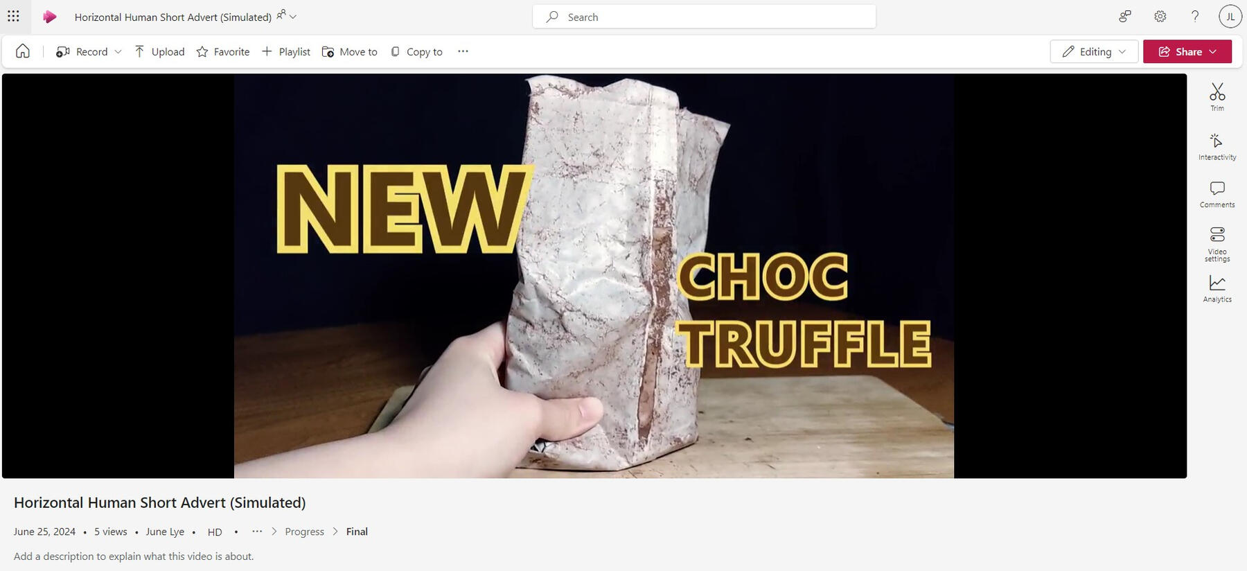 The post-production involved editing visuals and audio, including photography, footage and background music (Maio 2024). The process followed five steps: logging, arranging sequences, preliminary edit, refinement and finalised edit (Adobe 2024). During the rough cut, filming errors required retakes. Microsoft Excel was used for logging, while Adobe Illustrator, Photoshop and Premiere Pro edited the logo, online survey banner (Figure 14) and videos respectively. The editing of the banner and four 15-second ads took two weeks to accomplish. The shot of the truffle being taken out of the fridge (Shot 7) was replaced by the next shot due to inconsistencies in the original footage.The key struggles were colour grading, matching transitions using speed ramps and selecting copyright-free background music. Multiple colour adjustments were applied to achieving the desired navy blue and rusty brown tones. Since Google Forms only embeds YouTube videos, the ads were uploaded to SharePoint for secure storage (Figure 15-16), with links embedded in the form. Viewers were encouraged to use full-screen mode on mobile devices (Figure 17-18), which may reduce viewing intention (Laender 2018).