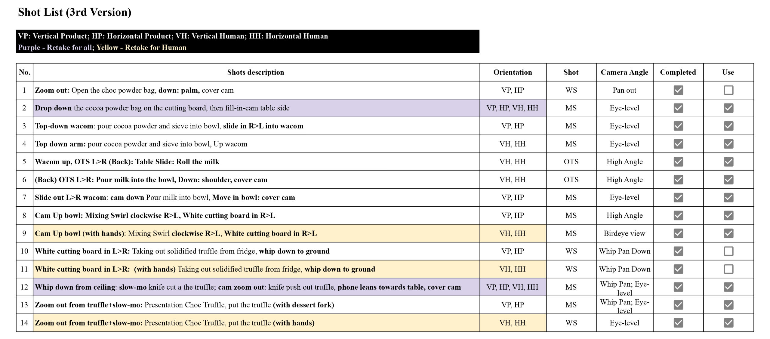 Table 1. Revised shot list.