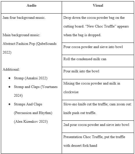 The AV script (Table 2) had clarified the time allocation for eight shots, with an average of 1.8 seconds per shot. During editing, adjustments for speed and music were synchronised well to capture viewers' attention such as the “elevator” in-camera transition bridged shots of “dropping cocoa bag” and “sieving cocoa powder” with smooth camera movement and catchy beats. This visual-audio synchronisation enhanced the overall viewing experience. Practical strategies for the next stages were planned within ethical and budgetary constraints, prioritising copyright-free sources and secure online storage.