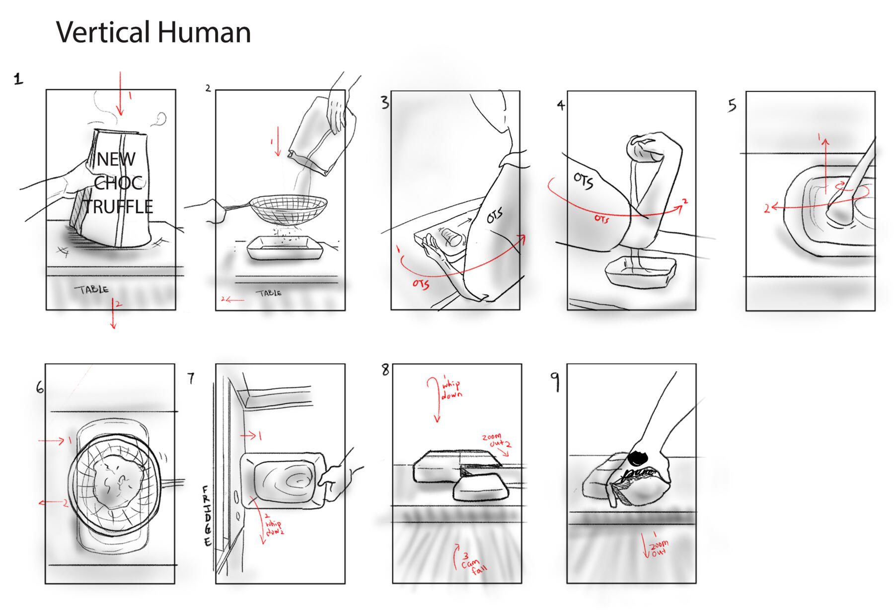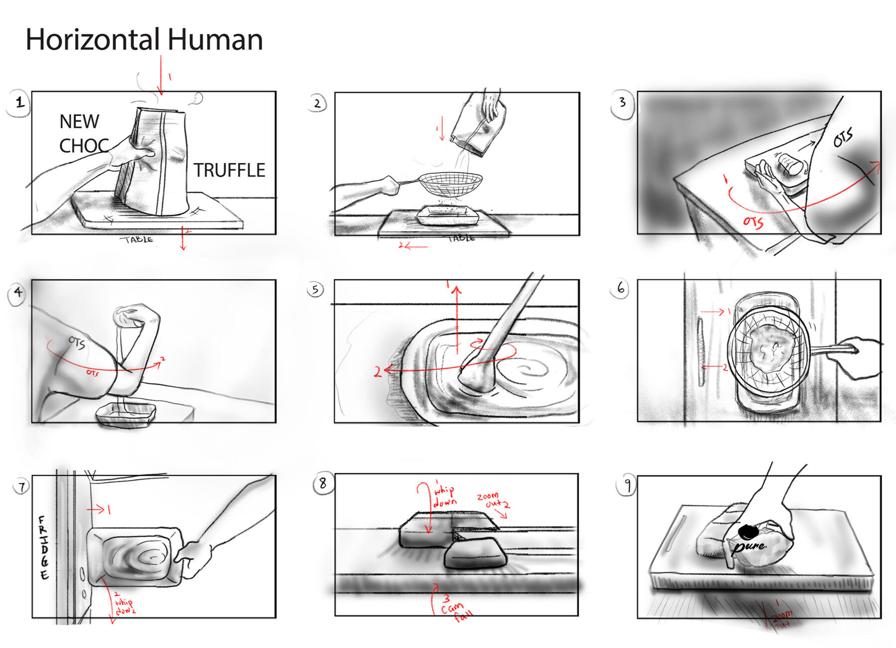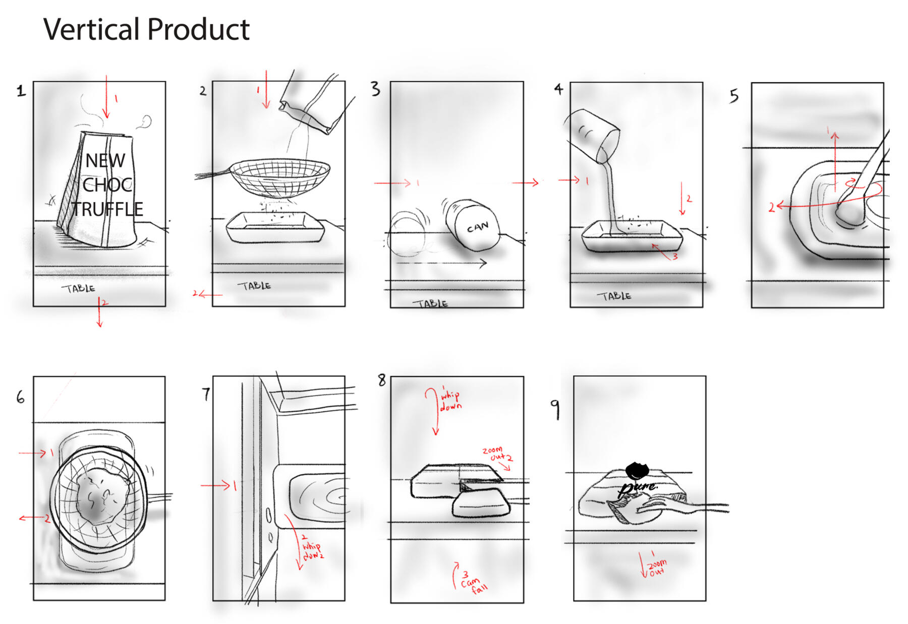 The final attempt (Figure 7-10) simulated a two-ingredient dessert: chocolate truffles, referencing Vais’s recipe (2021) using 80g of unsweetened cocoa powder and 180g of condensed milk. Since this is a self-funded project with a restrictive budget, the decision was made to simulate an easy homemade recipe. The rectified draft was simplified and incorporated more consistent creative in-camera transitions and various camera angles to minimise disparities, as listed in the revised shot list, which met ELM central and peripheral routes and IPM four factors (see Evaluative Essay Chapter 2). Each transition was carefully orchestrated to ensure seamless continuity between shots. For instance, the over-the-shoulder transition from shot 3 to shot 4 was executed with a left-to-right movement and shot 4 concluded by returning to the shoulder leading to a smooth transition into shot 5. Title and a simulated brand logo “pure.” were anchored in the beginning and the ending respectively to bolster the image of brand and product. The framing between vertical and horizontal varies in composition with vertical framing emphasises height and narrow focus, while horizontal framing highlights width and a broader space and information.