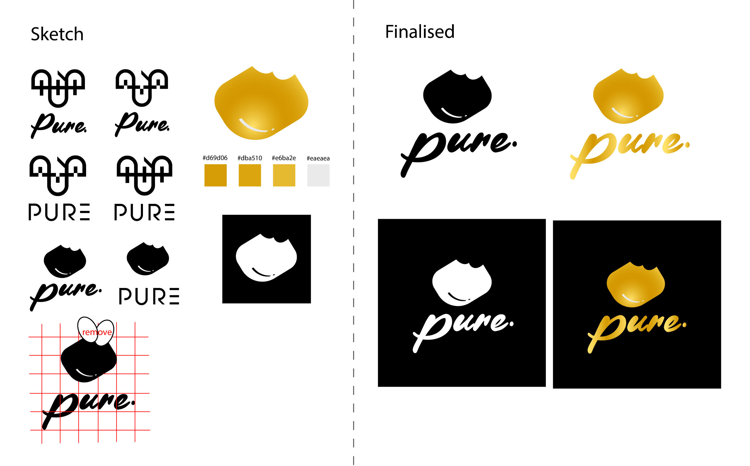 The simulated brand “pure.” (Figure 3) drew inspiration from renowned brands, confectionery brands such as Cadbury, Ferrero Rocher, Lindt, GODIVA, and a technology brand, Apple, aiming to establish a recognisable and memorable identity. The brand image featured a rounded-edge square silhouette of a truffle being eaten, complemented by the cursive brand name. A gradient golden hue, reminiscent of Cadbury or Lindt, which conveyed the luxury of the homemade truffles, with the golden colour contrasting elegantly against the navy blue background, enhancing the brand's premium image. The logo's versatility was demonstrated through its black-and-white and coloured versions, ensuring consistency and adaptability across different uses and backgrounds. The brand name “pure.” was styled in the elegant calligraphic typography “Biscuits with Chocolate.” The progression highlighted how the concept was refined from a complicated monogram logo sketch to simplified icon-based logo.