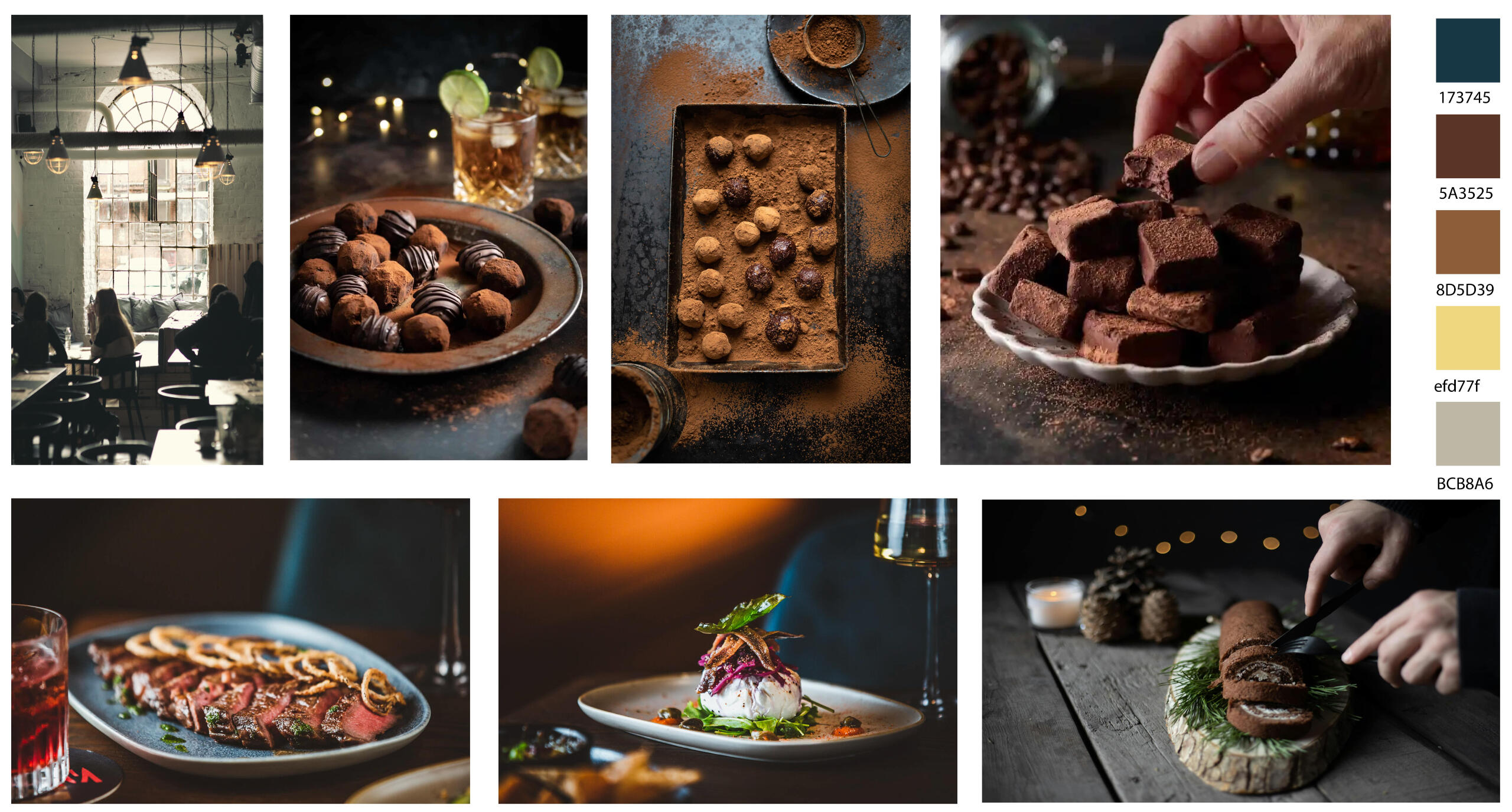 Besides lighting, colour also impacts how we perceive space (Wasserstrom 2022). From seven references, complementary colours of navy blue and rust brown were curated into a cohesive mood board (Figure 2). In modern restaurant interior design, the navy blue evokes a cosy, security and intimate ambiance while brown signifies warmth, naturalness and reliability (Daisie Team 2023; Wasserstrom 2022; Fraser-Smith 2016), leveraging contrasting hues and temperatures that are visually appealing and enticing. Despite the inclusion of five hues from the references, the focus remains on utilising navy blue as a supportive background to enhance the vibrancy and warmth of rust brown tones in subsequent phases.