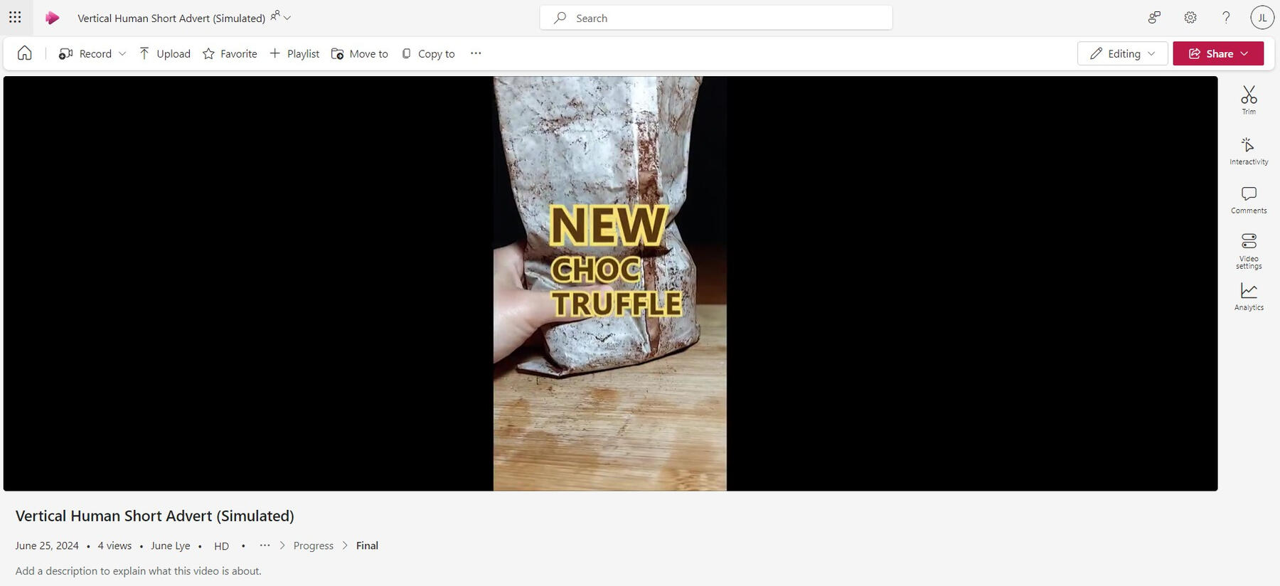 The post-production involved editing visuals and audio, including photography, footage and background music (Maio 2024). The process followed five steps: logging, arranging sequences, preliminary edit, refinement and finalised edit (Adobe 2024). During the rough cut, filming errors required retakes. Microsoft Excel was used for logging, while Adobe Illustrator, Photoshop and Premiere Pro edited the logo, online survey banner (Figure 14) and videos respectively. The editing of the banner and four 15-second ads took two weeks to accomplish. The shot of the truffle being taken out of the fridge (Shot 7) was replaced by the next shot due to inconsistencies in the original footage.The key struggles were colour grading, matching transitions using speed ramps and selecting copyright-free background music. Multiple colour adjustments were applied to achieving the desired navy blue and rusty brown tones. Since Google Forms only embeds YouTube videos, the ads were uploaded to SharePoint for secure storage (Figure 15-16), with links embedded in the form. Viewers were encouraged to use full-screen mode on mobile devices (Figure 17-18), which may reduce viewing intention (Laender 2018).